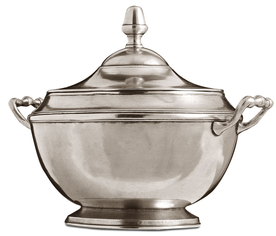 Questa piccola zuppiera in peltro, realizzata a mano dai nostri artigiani specializzati, evoca al tempo stesso la formalità di una cena ufficiale e la sensazione rilassata di fare le cose "come si deve".