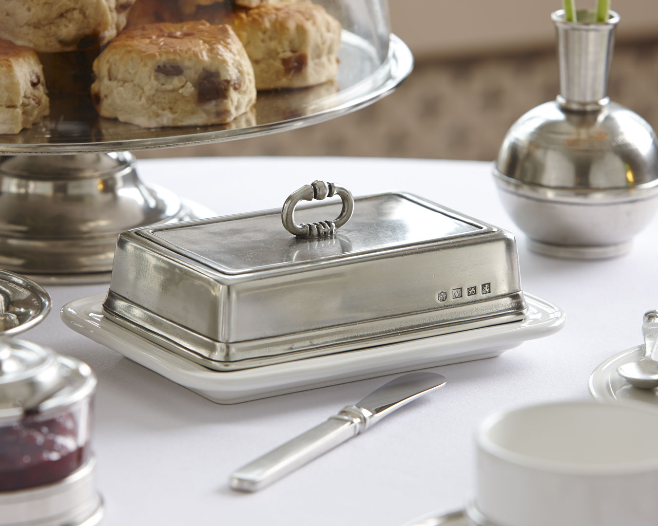 Realizzata a mano in peltro e ceramica dai nostri esperti artigiani, questa splendida burriera con coperchio apparirà in tutto il suo fascino posta sulla tavola, specialmente assieme ad altri oggetti della collezione "Convivio".