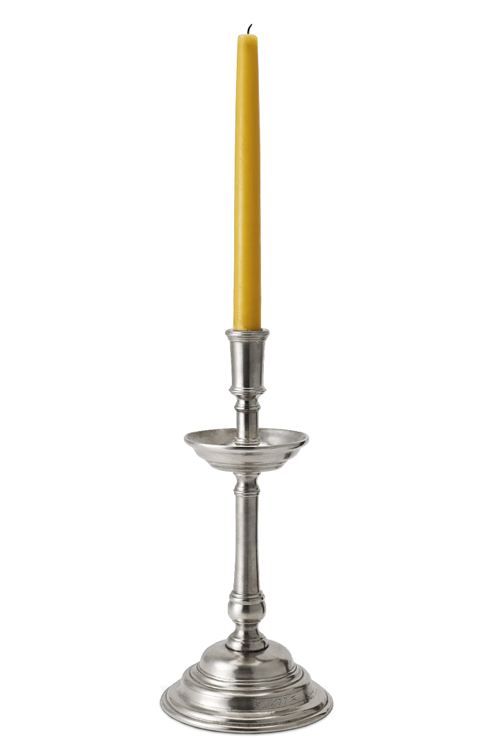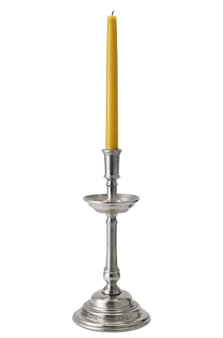 This elegant pewter candlestick combines the sobriety of tradition with the refinement of classic design. Its harmonious lines and rich ornamentation make it a decorative piece capable of enhancing both traditional settings and contemporary interiors with understated elegance. The base bears the engraved names of Saints Cosmas and Damian, patrons of physicians and pharmacists, a detail that recalls the symbolic and historical tradition of pewter objects. A candlestick designed to create atmosphere and add a timeless touch of elegance to the home.